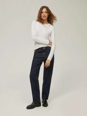 A sophisticated blue jean in pure cotton denim featuring an authoritative straight leg and architectural contrast stitching.