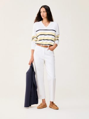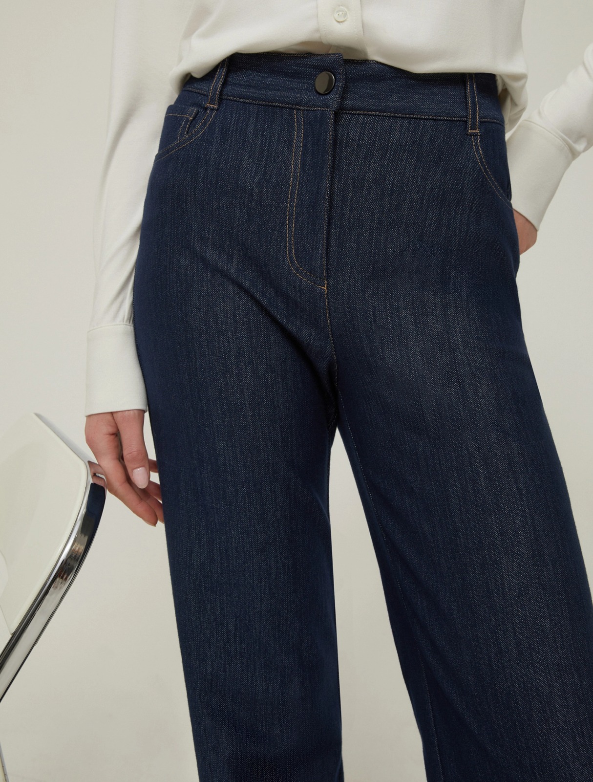 Description: Achieve the peak of effortless professional luxury with these Indigo Jersey Denim Trousers. Characterized by their unique denim-look stretch cotton-blend jersey fabrication, these trousers offer the authoritative aesthetic of denim with the exceptional comfort of knitwear. The architectural straight-leg construction creates a statuesque and polished profile suitable for creative professional environments or upscale weekend social scenes. The design features a mid-rise waist with belt loops, a classic 5-pocket design, and a refined concealed zip and press-stud fastening. This piece serves as a timeless statement of refined luxury and coordinates perfectly with the matching blazer also available in the collection.